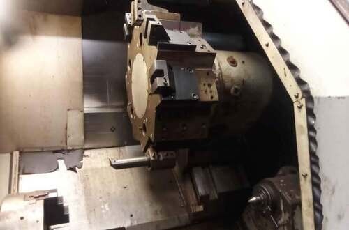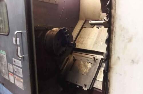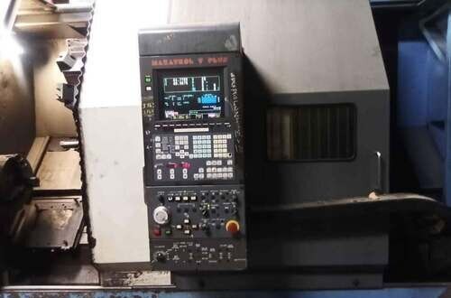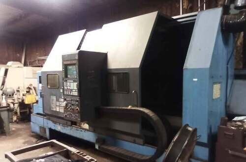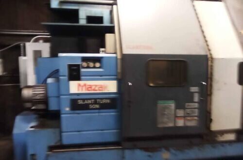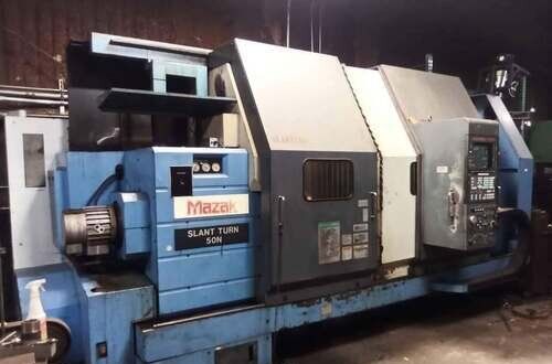 | 1998 Mazak Slant Turn 50N CNC Control Mazatrol T-Plus Year of manufacture 1998 Max. Swing Over Bed 31.69" Max. Swing Over Carriage 22.05" Chuck SMW BB-N-500-205-3 extended stroke air chuck (20” O.D x 8” I.D.) Max. Cutting Diameter 25.98" Distance Between Centers 80” Tailstock Diameter Taper 5.9" Max. Cutting Load 1763.68 lbs. Spindle Speeds, 3 Ranges 2-750 rpm Spindle Bore 7.1" Spindle Drive Motor 50 hp. Travel X-Axis 22.64" Travel Z-Axis 80" Rapid Traverse X-Axis 472.4 IPM Rapid Traverse Z-Axis 551.18 IPM Coolant Yes Chip conveyor Yes Approx. Weight 29,260 lbs. plus chuck Dimensions: Main body: 8’ 4” W x 19’ L x 9’ H. Chip conveyor: 22/42” W x 16’ L x 6’ H Equipped with: Tailstock, Chip Conveyor. Coolant, Way Lube, Hydraulic System.