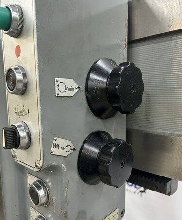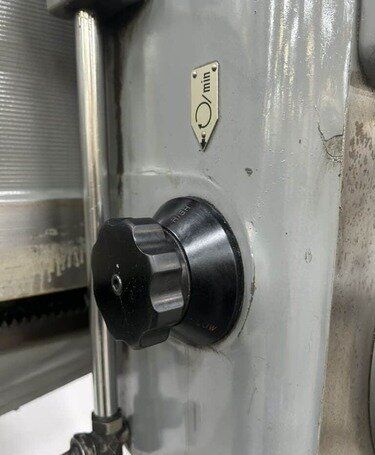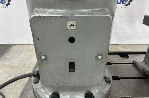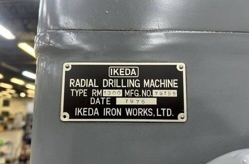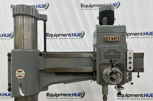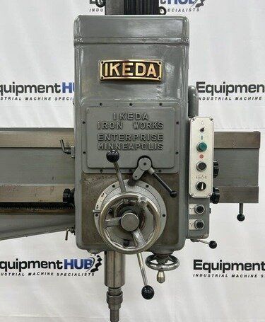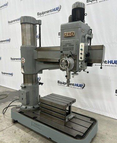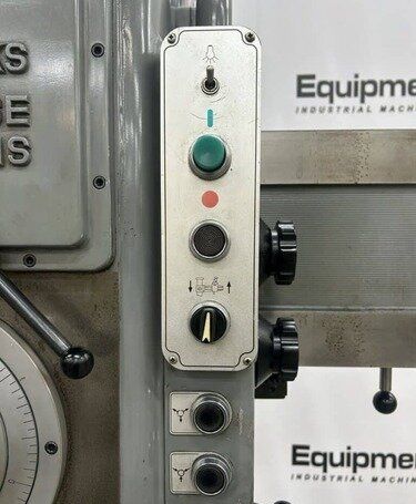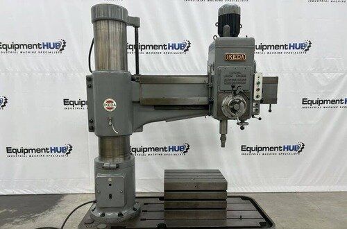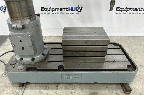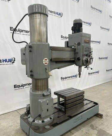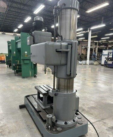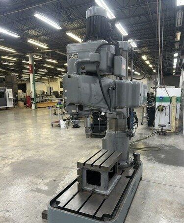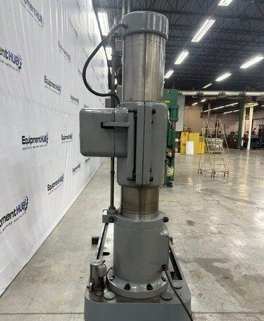 | Maximum Distance Spindle to Base: 52" Minimum Distance Spindle to Base: 10-1/2" Travel of Spindle: 11-3/4" Minimum Distance Spindle to Column: 10-1/2" Spindle Taper: #5 Morse Traverse of Arm on Column: 31-1/2" Traverse of Head on Arm: 36-3/8" (4) Quill Feeds: .004 to .021 Thousandths per Revolution (12) Spindle Speeds: 30 to 1440 RPM in 3 Gear Ranges Drilling Capacity: 1-3/4" Mild Steel, 2-1/8" Cast Iron EQUIPPED WITH: Plain Box Table Power Elevation of Arm on Column Power Clamping of Head on Arm and Arm on Column Coolant Pump 5 HP Spindle Motor Presently for Wired 3 Phase, 60 Cycle, 220/440 Volts Overall Size: 82" L-R x 36" F-B x 96" High x 8,000 Lbs.