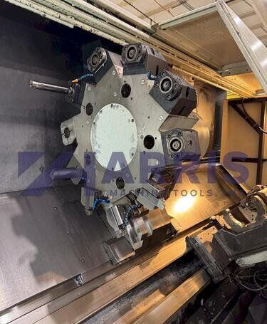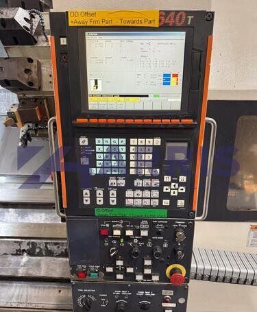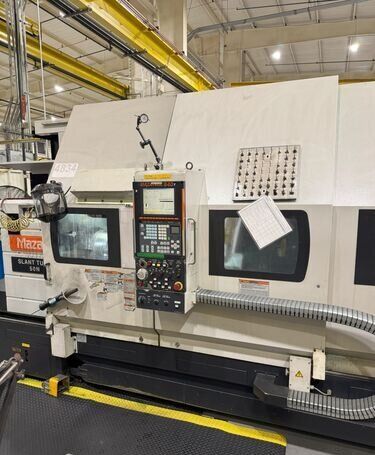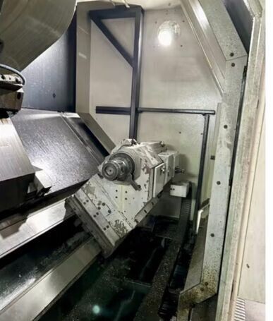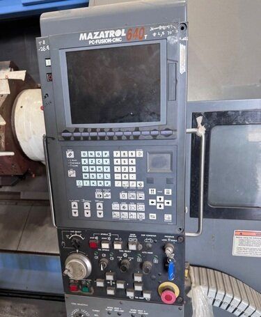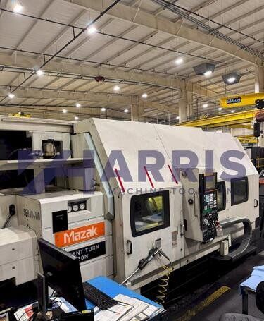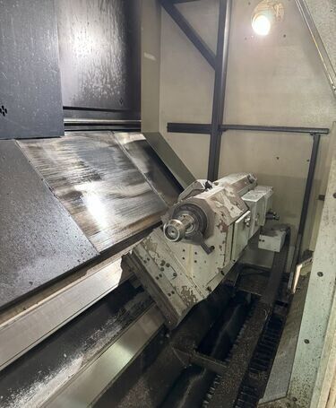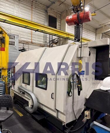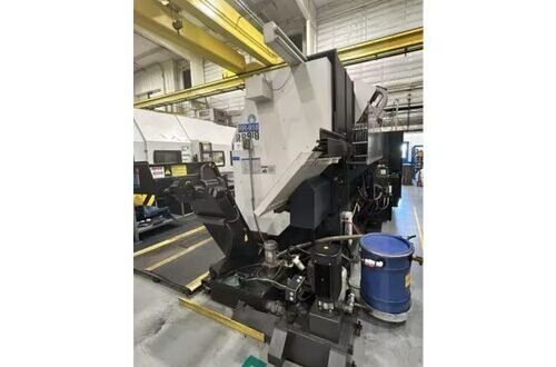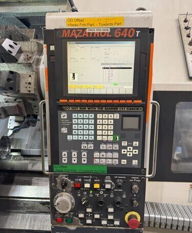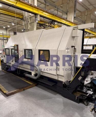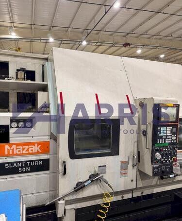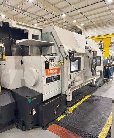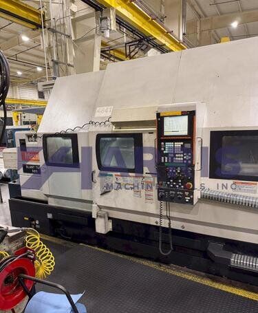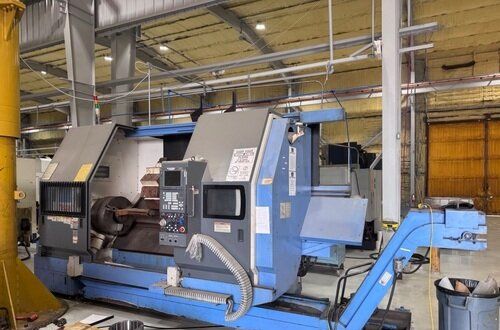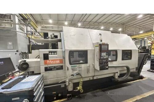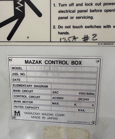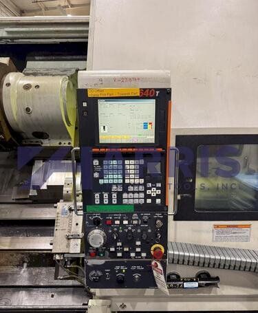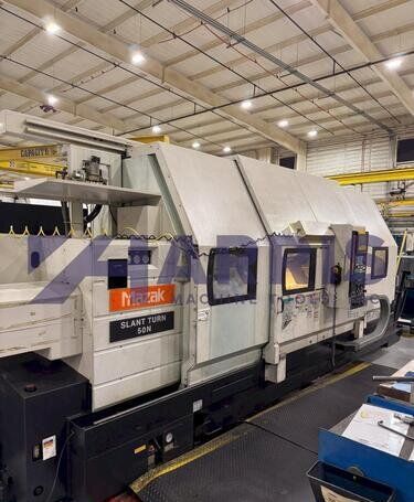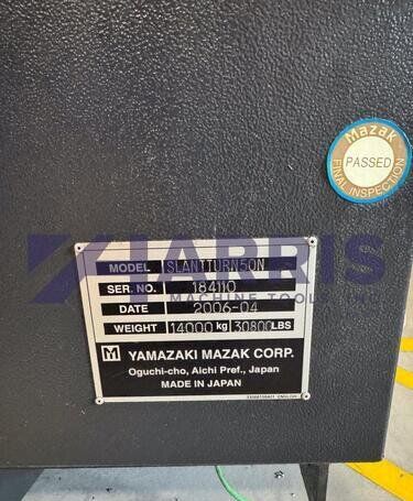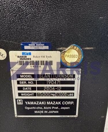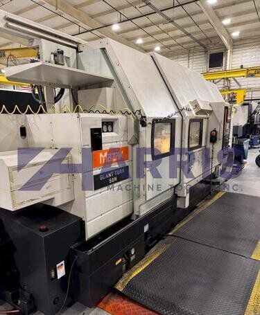 | 1998 Mazak Slant Turn 50N CNC Control Mazatrol T-Plus Year of manufacture 1998 Max. Swing Over Bed 31.69" Max. Swing Over Carriage 22.05" Chuck SMW BB-N-500-205-3 extended stroke air chuck (20” O.D x 8” I.D.) Max. Cutting Diameter 25.98" Distance Between Centers 80” Tailstock Diameter Taper 5.9" Max. Cutting Load 1763.68 lbs. Spindle Speeds, 3 Ranges 2-750 rpm Spindle Bore 7.1" Spindle Drive Motor 50 hp. Travel X-Axis 22.64" Travel Z-Axis 80" Rapid Traverse X-Axis 472.4 IPM Rapid Traverse Z-Axis 551.18 IPM Coolant Yes Chip conveyor Yes Approx. Weight 29,260 lbs. plus chuck Dimensions: Main body: 8’ 4” W x 19’ L x 9’ H. Chip conveyor: 22/42” W x 16’ L x 6’ H Equipped with: Tailstock, Chip Conveyor. Coolant, Way Lube, Hydraulic System.
