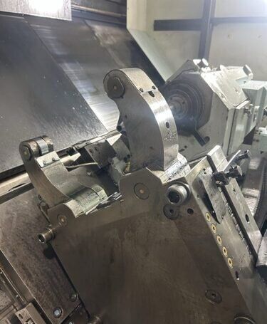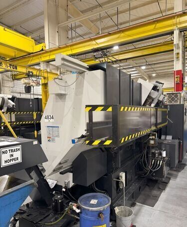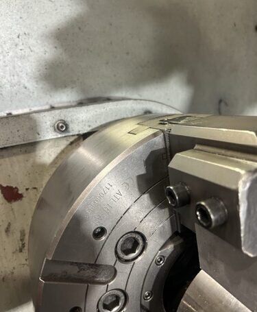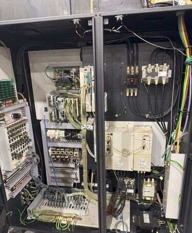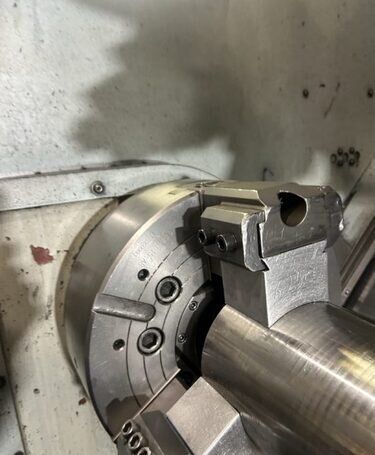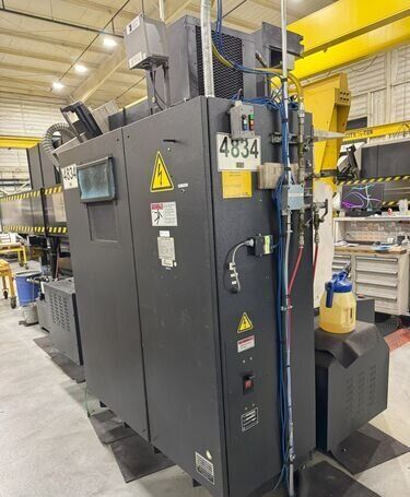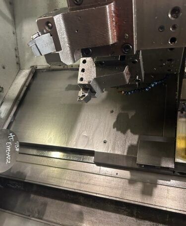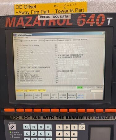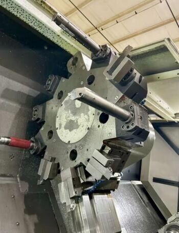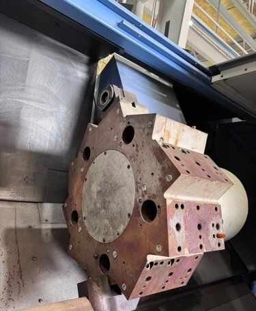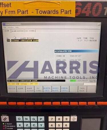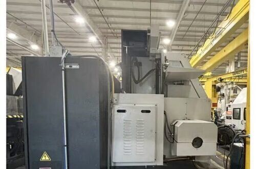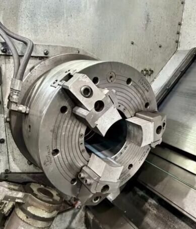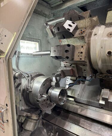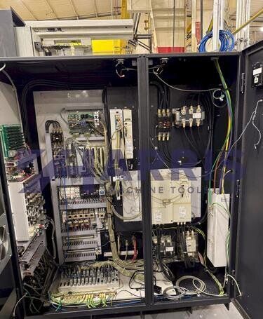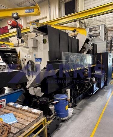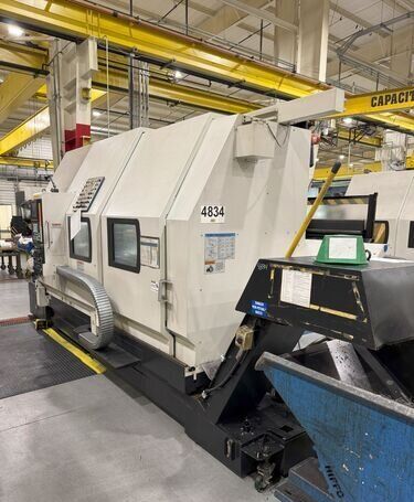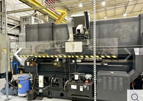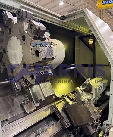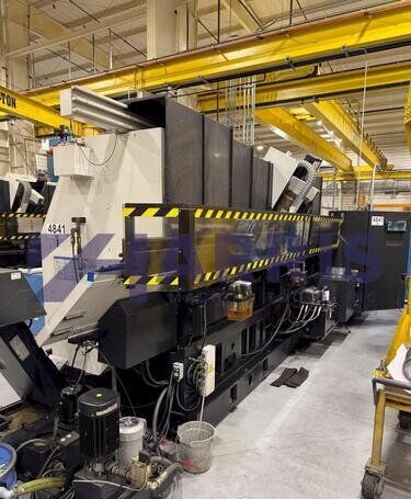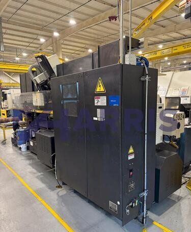 | 1998 Mazak Slant Turn 50N CNC Control Mazatrol T-Plus Year of manufacture 1998 Max. Swing Over Bed 31.69" Max. Swing Over Carriage 22.05" Chuck SMW BB-N-500-205-3 extended stroke air chuck (20” O.D x 8” I.D.) Max. Cutting Diameter 25.98" Distance Between Centers 80” Tailstock Diameter Taper 5.9" Max. Cutting Load 1763.68 lbs. Spindle Speeds, 3 Ranges 2-750 rpm Spindle Bore 7.1" Spindle Drive Motor 50 hp. Travel X-Axis 22.64" Travel Z-Axis 80" Rapid Traverse X-Axis 472.4 IPM Rapid Traverse Z-Axis 551.18 IPM Coolant Yes Chip conveyor Yes Approx. Weight 29,260 lbs. plus chuck Dimensions: Main body: 8’ 4” W x 19’ L x 9’ H. Chip conveyor: 22/42” W x 16’ L x 6’ H Equipped with: Tailstock, Chip Conveyor. Coolant, Way Lube, Hydraulic System.