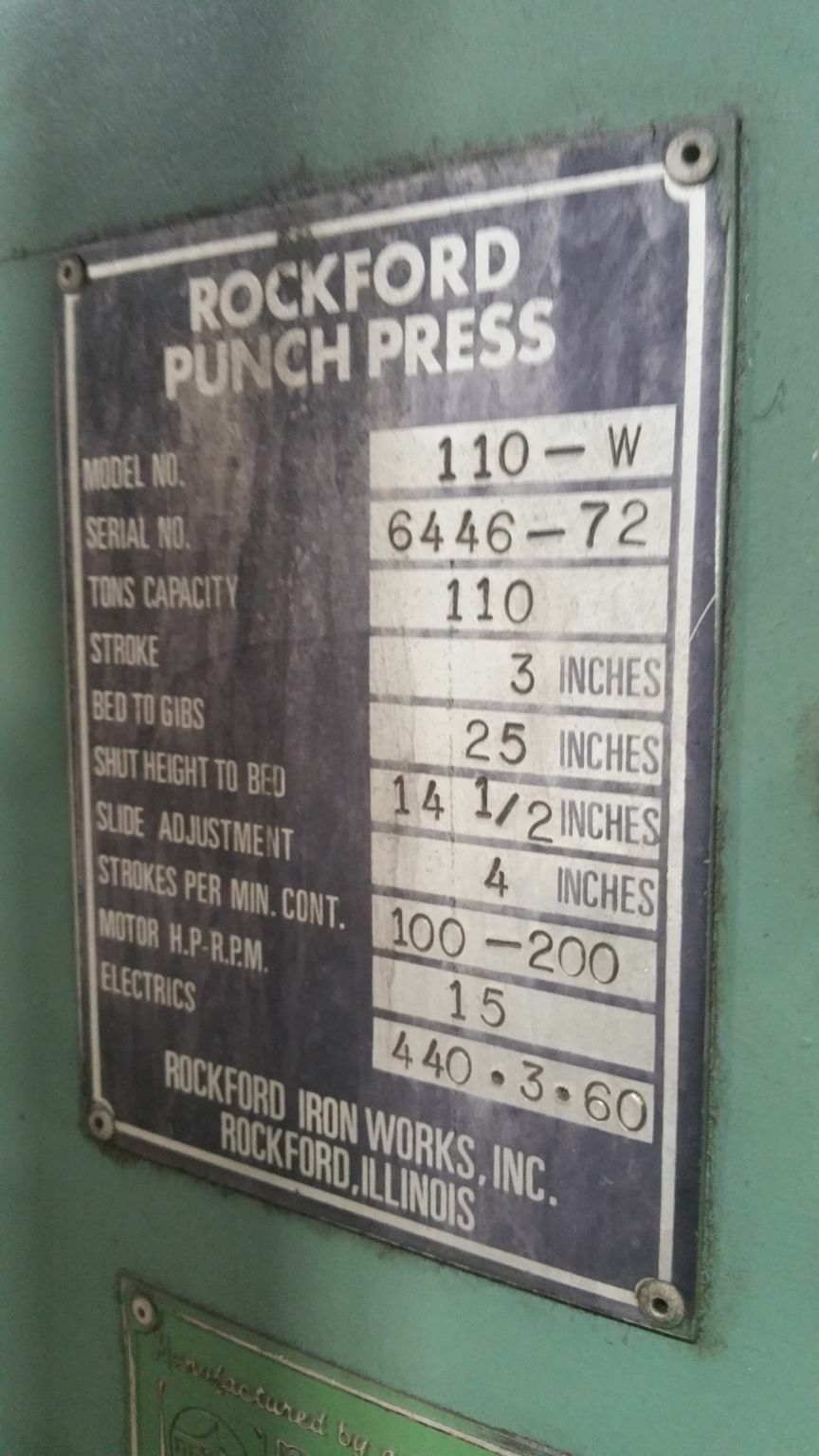 | 1972 Rockford 110-W 15 HP 440 Volt 3 Phase Punch Press Flywheel w/ 3" Stroke Punch Press Manufacturer: Rockford Iron Works, Inc. Model No.: 110-W Year of Manufacture: 1972 Electrics: 440 Volt / 3 Phase / 60 Cycle Power: Main Motor 15 HP Features and Specifications: Platen Size: 29″ x 22″ Bottom x 20″ x 28″ Top w/ (4) T-Slots Capacity: 110 Ton Stroke: 3″ Bed to Gibs: 25″ Shut Height (to bed): 14-1/2″ Slide Adjustment: 4″ Strokes per Minute Variable Speed Range: 100 – 200 Recirculating Oil System Functional Notes: Machine is in 100% operating condition with zero maintenance issues. Machine has been well maintained. Owner wants to sell because rarely utilizes for present production mix. Overall Machine Dimensions (approx.): 60″ x 64″ x 155″ Tall Machine Weight (estimated): 20,000 lbs.